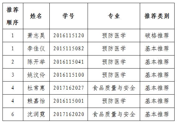 根据《麻豆av 推荐优秀应届本科毕业生免试攻读硕士学位研究生工作实施办法》(广医大发〔2018〕65号),按照学校《推荐2021届优秀应届本科毕业生免试攻读硕士学位研究生遴选工作实施方案》,学校分配给麻豆av 6个基本推荐名额。本次麻豆av 共计收到9份申请,其中申请基本推荐8人(预防医学专业6人,食品质量与安全专业2人),申请破格推荐1人(预防医学专业1人)。经麻豆av 推免工作小组评审遴选,按学校相关文件要求和分数高低,评选出前6名基本推荐,1名破格推荐共7名作为麻豆av 推荐人选,参加学校推免候选人评审。现对麻豆av 拟推荐候选人进行公示。